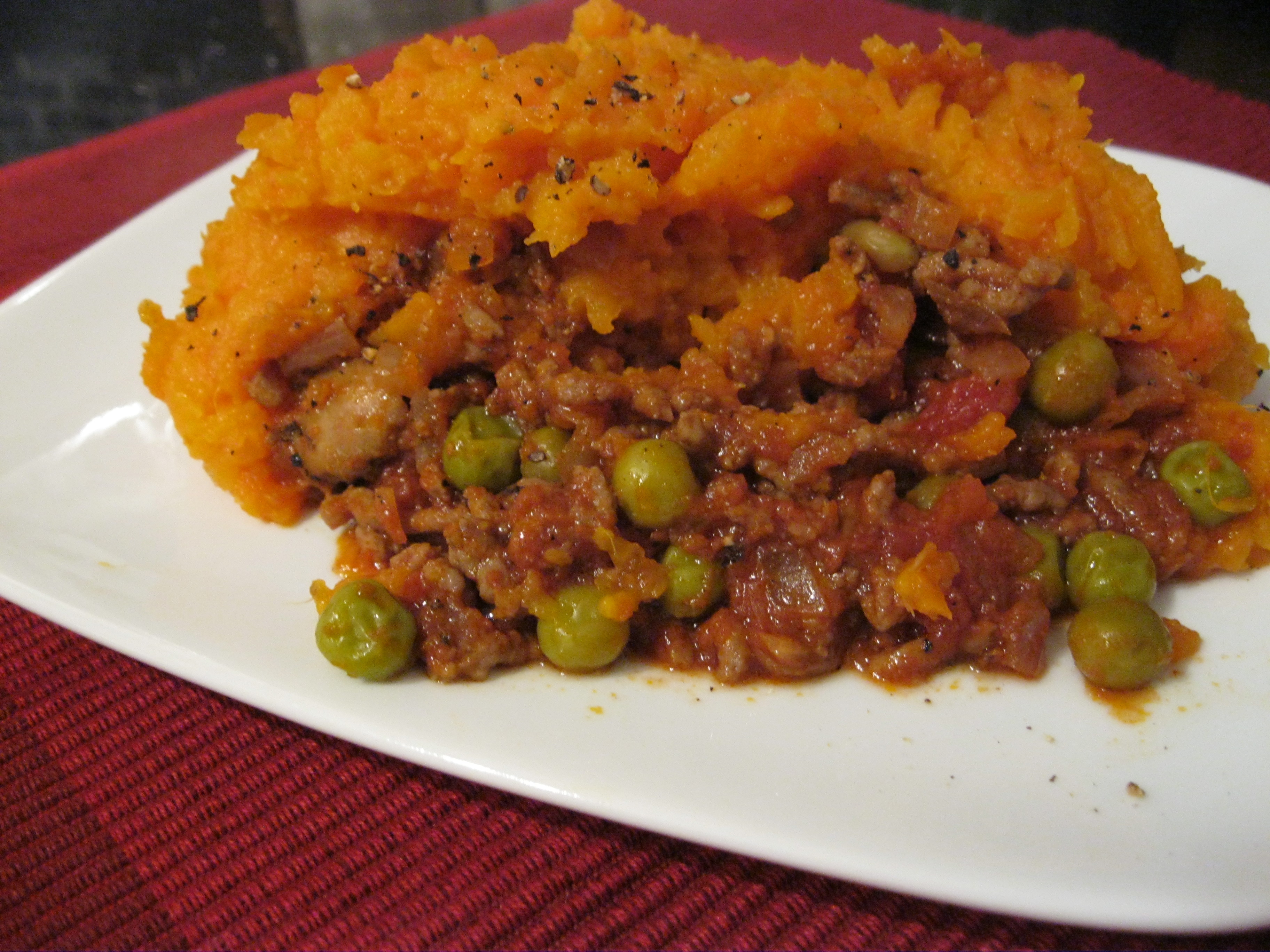I try to sneak in extra vegetables in my pie and also I like to switch the topping each time I make it.  This recipe uses sweet potatoes and carrots but I’ve used sweet potatoes and parsnips, celeriac and the classic white potato.  Use what you have at hand, you can also switch up the veggies used.  Make it your own.