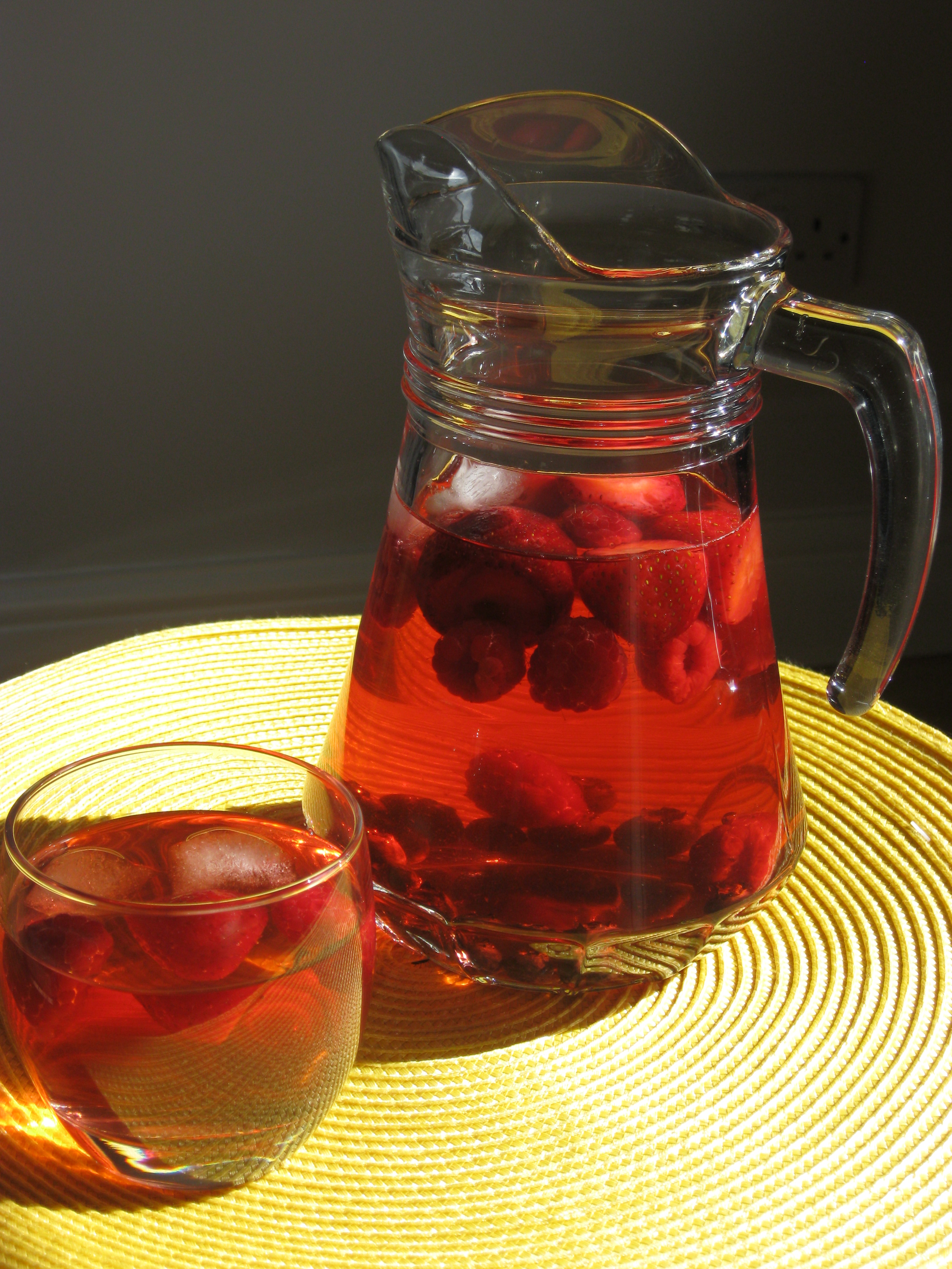 Add ice cubes and fruit and top up the jug with cold water.