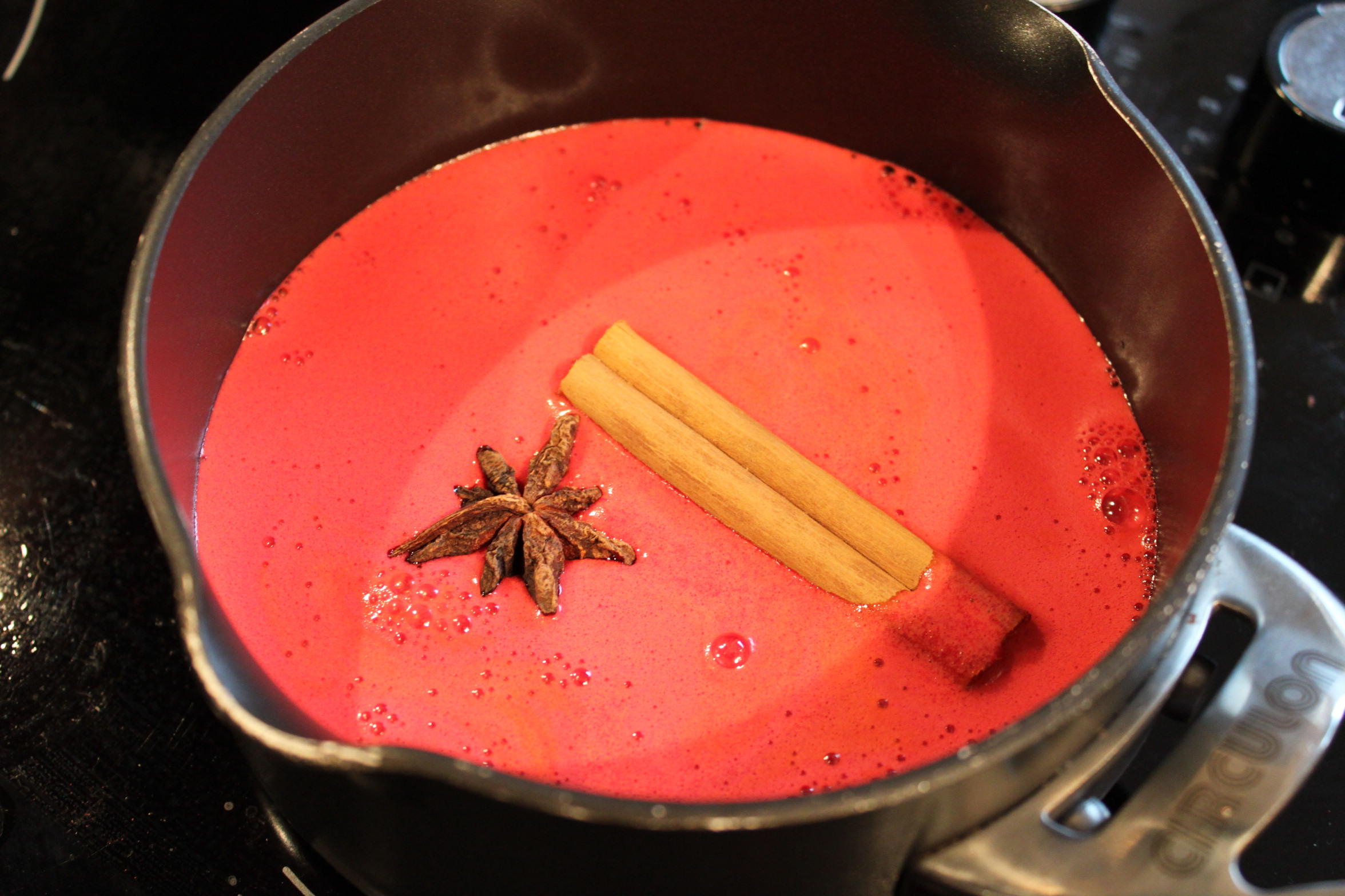 Pour the juice into a small pan and add cinnamon stick and star anise.